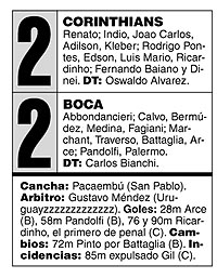 Cuando menos se lo esperaba, Corinthians se encontró con un penal a su favor luego de una falta de Bermúdez sobre Ricardinho. El propio volante fue el encargado de convertir al otro palo de Abbondancieri. Cuando todo parecía un triunfo tranquilo de Boca, los locales llegaron a la igualdad en el último minuto, luego de que Ricardinho rematara desde lejos (el disparo se desvió en Medina) y decretara el empate final.