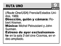 Ruta Uno es la historia de ese viaje de a dos. Uno fuera de campo, filmando, el otro en cuadro. Ambos recorrerán América tras una larga ausencia, atravesando la Costa Este a lo largo de más de 3500 kilómetros, desde la helada frontera con Canadá hasta los caribeños cayos de la Florida. Ese recorrido va armando algo que bien podría ser un Atlas de Geografía Humana en movimiento. Y también una radiografía de América, en un momento preciso: fines de los 80, cuando las reaganomics y la política de derecha todavía no abrieron paso a la era Clinton. Ya la vía misma que Doc y Kramer eligen para atravesar ese territorio tiene un alto valor significativo. Desde el propio nombre. Es la Ruta Uno, pero no parece serlo más, porque las autopistas velocísimas levantadas a su flanco la hicieron a un lado.