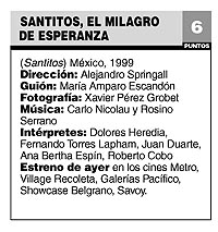 Film gratamente extraño, que juguetea con el realismo mágico, Santitos va de la iglesia al prostíbulo, y luego sale al camino, convirtiéndose en una suerte de road movie estática, anclada en ambientes cerrados en los que el desfile de personajes sucede sin necesidad de salir al camino. Lleno de lo mejor del costumbrismo latinoamericano –esa cotidianeidad burocrática que para el primer mundo es algo mágico–, Santitos tiene curas que deben ir al baño en medio de una charla o empleados del Estado que le recuerdan a su interlocutor que no golpee su escritorio porque tiene un vidrio roto. Drama que no olvida su humor a la hora de recorrer su trama, la ópera prima del mexicano Alberto Springall termina paradójicamente perdiendo su dinamismo con el correr de su movimiento.