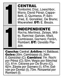 ![]() Sólo los primeros minutos del encuentro fueron para Independiente, porque manejó mejor la pelota del medio hacia adelante, lo que le permitió generar al menos tres situaciones de gol, que no se concretaron gracias a la gran labor del arquero Laureano Tombolini, la figura de los rosarinos. Pero Central logró emparejar el trámite con un par de llegadas que pusieron un poco de emoción y de peligro en el área de Rocha. El tono general fue de pobreza. Los dos cometieron demasiados errores y carecieron de claridad para definir las escasas situaciones de gol que generaron, más por equívocos ajenos que méritos propios. Recién a los 20 minutos del tiempo complementario, cuando el partido parecía condenado a ser más de los mismo, Esteban Cambiasso, con un remate violento desde el borde del área chica, consiguió la ventaja para su equipo, luego de una habilitación de cabeza de Milito, que lo dejó solo frente a Tombolini. El gol obligó a Central a salir a buscar el descuento. Un minuto después se lo perdió Marra. Y dos minutos más tarde, llegó el 1-1, tras una muy buena habilitación de Cáceres a Ezequiel González, quien casi desde la puerta del área conectó un remate que Rocha no pudo contener. Sobre el final, con los varios cambios en la cancha, el encuentro se volvió dinámico. Después de todo el esfuerzo desperdiciado, ni Central ni Independiente parecían dispuestos a resignar los dos puntos. Ese fue otro partido: los dos se acordaron que la cita era con el fútbol.