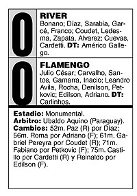 El primer tiempo fue bastante intrascendente, pero igual River tuvo más la pelota, llegó mejor. A pesar de la capacidad que se les reconoce a jugadores como Damián Alvarez, Nelson Cuevas y Víctor Zapata y el peligroso Cardetti, se notaron las ausencias de los cuatro ofensivos de lujo. A River al principio le costó superar la presión que expuso Flamengo en la mitad de la cancha, pero después consiguió abrir el frente de ataque, en especial por Hernán Díaz en el sector derecho. También fue importante la tarea de Cristian Ledesma, quien evitó que Petkovic organizara a los brasileños. Estos apelaron a las infracciones frecuentes para ponerle freno a los ataques de River, que se acercó al gol durante el primer tiempo por intentos de Ariel Franco, Cardetti (dos veces) y Alvarez. La ocasión clara que tuvo el Flamengo en esa etapa se dio a los 36 minutos, cuando, como consecuencia de un contraataque rápido, Leonardo Inacio remató y tapó Bonano, pero la pelota pegó en Ariel Garcé y se fue al corner.