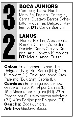 Por Ariel Greco ![]() En el inicio, Boca arrancó con una actitud muy decidida. El equipo conducido por Carlos Bianchi salió a presionar bien arriba con sus volantes y delanteros, y de esa manera ahogó a Lanús contra su arco. En esos primeros 15 minutos, Boca estuvo cerca de la perfección: convirtió dos goles (el primero Delgado con una media vuelta, y el segundo Serna, con un derechazo de muy lejos), creó cinco situaciones más, y desbordó a Lanús en todos los sectores de la cancha. Los dirigidos por Miguel Russo apenas pudieron inquietar con una jugada en el comienzo, en donde el arquero Oscar Córdoba le tapó el gol a Ariel López en un mano a mano. A esa altura, la Bombonera era una fiesta: el equipo jugaba bárbaro, la gente deliraba y como postre apareció Maradona. Sin embargo, la presión ejercida por el local fue disminuyendo, y permitió una lenta paro paulatina levantada de Lanús. De esa manera, Capria comenzó a tener más contacto con la pelota, y Klimowicz empezó a martirizar a los centrales de Boca. A partir de ese momento, a Boca no se le hizo cómodo el trámite. El juego se enredó, Riquelme no apareció tan solo, y los delanteros casi no generaban situaciones. En cambio, Lanús aprovechó las distracciones de Boca para emparejar el partido, y se acercó en el resultado. En un centro frontal de Capria, Klimowicz anticipó a toda la defensa y la colocó por arriba de Córdoba. Con el 2-1 Boca levantó un poco su producción, pero no llegó a parecerse al del inicio. Además, siempre estaban latentes los posibles contragolpes de Lanús. Luego del descanso, todo lo bueno que había realizado Boca en la primera parte quedó en el archivo. Boca no jugó el partido sino que lo sufrió. Casi nunca hizo pie en el medio, y en el fondo dio demasiadas ventajas ante un delantero de real jerarquía como Klimowicz. Por ello, Córdoba tuvo que intervenir dos veces para salvar la victoria: primero tapándole un cabezazo a Ariel López, y luego una entrada franca a Klimowicz. Cuando más difícil pintaba el panorama, apareció nuevamente Palermo. El delantero fabricó un tanto de la nada, ya que en un centro intrascendente, anticipó a Flores y a un defensor, y con dos cabezazos convirtió el 3-1. El resultado parecía definitivo, pero la improvisada defensa de Boca se encargó de demostrar que no era así. Otro error le permitió a Capria marcar el descuento y prolongar el suspenso. Así Boca terminó sufriendo hasta el último segundo para festejar una victoria más.