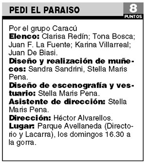Por Inés Tenewicki Exactamente en el hilo de un relato es como se sienten los espectadores de Pedí el Paraíso, del grupo Caracú, sentados en las verdes butacas del Parque Avellaneda para disfrutar de uno de los pasajes más representativos de la literatura gauchesca. Basado en el libro de Güiraldes, este grupo de teatro callejero adapta y dramatiza el capítulo XXI que dio por nombre al espectáculo. La obra está ambientada en un paisaje gauchesco, con un rancho que resulta ser una herrería; el cielo y el infierno apostados de costado y la gobernación completando la escenografía. De esta manera, el público queda en el centro de estos cuatro frentes que comprenden una extensión de aproximadamente 20 metros, y no es casual. Parece que este tipo de teatro apuesta a un acercamiento entre los actores, el público y la obra de una manera acogedora. Cerca de doscientas personas se arriman entre mates y bizcochitos –al mejor estilo campero– a disfrutar una obra que sabe qué decir y cómo hacerlo.Dios se pasea en zancos junto a San Pedro y una mula en busca de una herrería. Dan así con Miseria, el herrero que resuelve solucionar el problema con lo único que tiene: una argolla de plata. Por no haberles cobrado el arreglo de la herradura, Dios y San Pedro deciden concederle tres deseos. Este es el comienzo de una historia conocida: la del hombre que le vende su alma al diablo. En el gran escenario que es el Parque Avellaneda, donde se ha generado una movida cultural importante –responsabilidad de los vecinos y el Gobierno de la Ciudad–, todos los domingos a la tardecita, siempre que el sol acompañe, se desarrolla esta obra. Cuenta con enormes y vistosos muñecos, bombas de humo y estruendo, canciones al mejor estilo murga que levantan a los niños del suelo y los invita a participar. Estos son algunos de los recursos a los que apela esta obra callejera. Y debe entenderse esta característica como una opción estética y no una alternativa económica, poniendo el acento en un tratamiento especial de la palabra, apostando a la energía del actor que dice mucho en pocas palabras sin desvirtuar el texto original. Se transmite claramente el sentido de éste, pero de una manera afable y directa, que no sólo llega a los espectadores sino que también los participa. De esto se trata: de atrapar al simple visitante en la red de un espectáculo que le pedirá no solamente que abra sus ojos sino que comprometa también su cuerpo en la historia y se convierta así en protagonista. Una propuesta arriesgada y seductora, alcanzada exitosamente. Hay que ver sino como los chicos festejan junto a Miseria los veinte años de juerga que el Diablo le ha concedido a cambio de su alma, entre cantos murgueros y trencitos que se abren paso entre la gente. O como en otro de los pasajes en el que Miseria, al ser rechazado en el Cielo y el Infierno, pregunta si alguien se lo quiere llevar a su casa y más de un chico levanta su mano y asiente con la cabeza. Esa distancia que se acorta entre los actores y el público tiene su correlato también en el lenguaje. Es valorable cómo este grupo recupera un clásico como Don Segundo Sombra, escrito hace más de setenta años y que sigue vigente en su temática, pero que difícilmente es abordado fuera del ámbito escolar. Caracú actualiza esta obra fundamental, dándole un giro al lenguaje con un modo coloquial que permite un acceso rápido y divertido, mostrando la actualidad de su contenido: “Al lado del poder la miseria se ha instaurado” dice sobre el final. Así la tarde se pone y el público, lentamente, se va pensando.