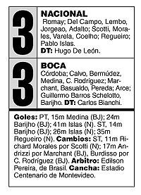 El Boca muletto de anoche sacó un notable rédito de la primera mitad del período inicial: ante la pasividad de un Nacional desorientado, dominó el juego, en el medio y en las áreas, y llegó dos veces al gol. Marchant, Basualdo, Pereda y Arce controlaban la pelota con soltura. Así llegaron los goles: primero fue un tiro libre recto de Medina, fuerte y rasante, que atravesó una insegura barrera y se le metió a un Romay que la vio llegar demasiado tarde. Y al ratito un corner ejecutado por Guillermo Barros Schelotto –muy activo desde el principio– fue cabeceado con llamativa tranquilidad por Barijho a un metro del arquero y de la línea de gol: 2-0 sin despeinarse.