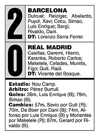 De forma irónica, fueron los autores de los dos tantos dos jugadores que suponen una respuesta a la fuga de Figo al eterno rival: el jugador que hizo el camino inverso y el heredero natural del portugués en su puesto. Pero ellos sólo fueron la punta de lanza de un equipo corajudo, frenético, que impulsado por el terrible ambiente reinante en el estadio barcelonista se apoderó del partido y terminó por momentos poniendo al borde de la humillación al campeón de Europa.