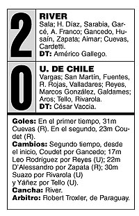 Durante el primer capítulo River fue tan amplio dominador que antes de llegar a los diez minutos había dispuesto de tres oportunidades muy claras para convertir: un remate de Aimar sobre el travesaño y dos disparos de Cardetti que atajó Vargas. A los 34 inclusive hubo una maniobra personal de Cardetti que los chilenos detuvieron con una infracción dentro del área, pero el árbitro paraguayo Roberto Troxler dio ley de ventaja y Zapata tiró sin la dirección adecuada. El desnivel de un gol fue poco premio para la diferencia que se vio en el campo.