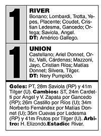 Javier Saviola, para el local, y Daniel Tilger, para la visita, anotaron los goles del encuentro que dio inicio a la duodécima fecha del certamen. El equipo de Américo Gallego, vestido de negro, eligió el atuendo ideal, para sufrir otra jornada desafortunada que se transformó en la quinta sin conocer victoria. De esta manera, River sumó 23 puntos y quedó a siete de Boca; mientras que Unión acumuló 14 unidades.