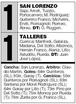 El partido comenzó cumpliendo las expectativas que generaban dos equipos con ilusiones de pelear el título. Por un lado, San Lorenzo buscó tomar la iniciativa a partir de la conducción de Romagnoli y las subidas de Erviti. Claro que enfrente se encontró con un rival dispuesto a jugar y a no regalarle nada. Si bien los cordobeses no adoptaron una actitud netamente ofensiva, tampoco se refugiaron en el fondo, ya que la premisa del técnico fue defenderse con el balón. Y ante cada oportunidad que se le presentó, Talleres intentó agredir a los locales. Así, en ese pasaje, los visitantes fueron los más peligrosos, sobre todo con un remate de Rueda que controló Saja con esfuerzo. De a poco, San Lorenzo le fue encontrando la vuelta al encuentro, con más voluntad que juego. Y de esa manera consiguió generar las dos chances más claras de la etapa inicial. En la primera, Alaniz sacó de cabeza en línea un remate al gol de Portocarrero, y en la siguiente fue Cuenca el que evitó el tanto de Ameli, que le cabeceó a quemarropa al palo izquierdo. Con el trámite cada vez más parejo, el partido se fue ensuciando. Entre las piernas fuertes, las simulaciones y la pasividad del árbitro Claudio Martín, las intenciones del principio fueron quedando en el olvido. El juego perdió ritmo, y las situaciones de gol ya no fueron tan frecuentes. El comienzo de la segunda parte encontró a un Talleres mucho más convencido de sus potencialidades, mientras que San Lorenzo lucía errático y perdido en el terreno. Por eso, sin generar demasiado peligro, los cordobeses se mostraron más incisivos. Y pudieron ponerse en ventaja con una entrada que definió Rueda a lo Chelo Delgado, que tapó bien Saja. Sin embargo, cuando Talleres dominaba con claridad y San Lorenzo deambulaba en la cancha, apareció Quinteros para colocar el 1-0 con un derechazo impresionante luego de haber dejado en el camino a Galarza. A pesar del golpe, Talleres pareció no sentir el impacto y siguió siendo superior a los locales. En la mejor chance que se le presentó, Rueda dejó en el camino a Saja, pero desvió el remate final con el arco vacío. Los cordobeses siguieron insistiendo, pero se encontraron con una soberbia tarea de Saja, que le quitó el tanto del empate a Monroy y a Astudillo en sendos mano a mano. Hasta que Garay empalmó un centro atrás y le dio justicia al marcador.