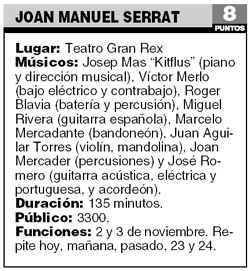 Por Fernando D’Addario![]() Este juego, que en sus primeras presentaciones en Buenos Aires resultó agradable al gusto de un público que lo venera más allá de los palíndromos, quizás se manifieste anecdótico –aunque funcional– frente a la realidad integral de un artista que prefiere, a esta altura de su carrera, despojarse de la gravedad para desnudar su esencia más íntima. Es sin duda un Serrat auténtico el que eligió, readaptó y cantó cansiones (el “chiste” ortográfico sólo tiene significación en la fonética española) de origen latinoamericano, prescindiendo de entregarse plácidamente al cover e incorporándolas con naturalidad a su inconfundible manera de “decir” la música. Claro que también es sin dudas un Serrat auténtico (¿o un Tarrés?) el que resignó su ego de autor inspirado para dejarse atrapar por ritmos (vallenatos, rancheras, boleros, etc.) seductoramente ajenos a su naturaleza mediterránea. Una banda amable, correcta y por fortuna alejada de los efectismos sonoros que había evidenciado en la gira de presentación de Sombras de la China, cobijó la levedad artística de Serrat, que no debe entenderse como una liviandad de contenidos, sino como un aligeramiento de las formas. A saber: la “Mazúrquica modérnica” de Violeta Parra (esa que dice “No hay regimiéntico que los deténguica si tienen hámbrica los populáricos”) es un terrible alegato contra un sistema represivo, adornado con una estructura semántica graciosa, que Serrat potencia con sus guiños y sus mohínes. Cuando un mozo sube a escena y sirve en una mesa un vaso de vino, Nano descontractura la melancolía de “El último organito” y antes de empezar a cantar le dice a una platea dispuesta a aplaudirlo todo, pero mucho más si está Buenos Aires de por medio: “Este es el sueño de mi vida: traer el bar al escenario”. Su interpretación de “Fangal”, que no abusa de innecesarias posturas arrabaleras, pero deja entrever ciertas gestualidades canyengues, provoca risas cómplices, que nadie se atrevería a rubricar si el cantante en cuestión fuese el mismísimo Edmundo Rivero. Serrat/Tarrés cometió la osadía de dedicarle los primeros 70 minutos del show a las canciones de su último disco, que tiene buenos momentos y otros no tanto (fue imposible reemplazar en “La llamada” la participación de Hugo Fatorusso y la cuerda de tambores La Calenda Barrio Sur, que estuvieron en el CD, por dar solo un ejemplo). Esta decisión valiente incidió decididamente en las variables del aplausómetro, que se mantuvo en términos estándar durante la primera parte del recital y acusó un desbarajuste cuando el repertorio se dejó ganar por los clásicos, que fueron llegando de a poco, tal vez siguiendo una lógica de la temperatura ambiental que solo los grandes son capaces de manejar. “Una mujer desnuda”, “Mediterráneo”, “Cantares”, “La Saeta”, “Penélope” llegaron sólo para darle certificación al ritual y fueron la excusa para que miles de argentinos cantaran desde el principio hasta el final esas historias sin tiempo, que parecerían condenar a quien las escribió a una inmutabilidad de privilegio, pero también peligrosa. Serrat mostró en Buenos Aires sus anticuerpos, que prefirió revelar explícitamente sólo a través de un alter ego capicúa. Fue Tarrés, acaso, el que, sin deberle cuentas a la épica setentista (sólo hubo sobrias alusiones a Eduardo Galeano y Alejo Carpentier) le sugirió a su “socio” recostarse en músicas olvidadas de esta parte del mundo, que es otra manera de decir que sí, evidentemente, el sur todavía existe.