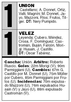 ![]() En el inicio, Vélez se mostró más decidido para tomar el protagonismo del partido. Desde los primeros minutos se paró en el campo de Unión, y comenzó a adueñarse de la pelota a través del buen trabajo de Castromán y Morigi en la mitad de la cancha. De todas maneras, el equipo de Liniers llegaba hasta la puerta del área de Castellano, pero no tenía profundidad. Mientras, los santafesinos sólo se apoyaban en el recurso del contraataque. Y consiguieron acercarse a Leyenda a través de un remate de Frutos que se fue por arriba, luego de que Tilger se la bajara de cabeza en la puerta del área. A partir de ese momento, Vélez fue el que tuvo las mejores oportunidades. Primero fue Federico Domínguez, que no llegó a empujar un cabezazo de Crosa. Después fue el colombiano Castillo, pero su disparo (antes se sacó dos jugadores pisando la pelota hacia atrás) fue rechazado por Castellano. Y como consecuencia de ese dominio, el único gol del partido llegó a los 22 minutos por intermedio de Morigi: Castromán ganó una pelota por la derecha, tiró un centro y Morigi cabeceó solo al segundo palo de Castellano. En esa etapa, Unión recién llegó con peligro a los 40 minutos, cuando Matías Donnet probó de lejos, pero su derechazo se fue por arriba. Luego del descanso, Vélez siguió dominando y acorraló a Unión en su área. Con centros y disparos desde lejos, los visitantes estuvieron cerca de aumentar la diferencia. El que más buscó fue el defensor Diego Crosa. Primero su cabezazo terminó en el techo del arco, y después fue Castellano el que le contuvo otro cabezazo en la línea. El equipo de Tabárez realizó un gran trabajo de presión sobre la salida de Unión, y no le dejaba controlar la pelota. Sin embargo, a partir de los 15 minutos de la segunda parte, Unión logró salir de esa presión y se fue más decidido en busca del empate. Y el que tuvo su chance fue otra vez Matías Donnet, pero su derechazo bajo se fue al lado del palo izquierdo de Leyenda. Dos minutos más tarde, el joven Leyenda le ganó un mano a mano a Tilger. Pero el desahogo llegó en el último minuto: el ingresado Parmiggiani cabeceó un córner de Castillo y decretó el empate final. Unión había encontrado su premio.