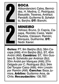 El primer tiempo fue muy entretenido porque Boca salió decidido de entrada a alcanzar una ventaja clara, los dos goles que necesitaba. Consiguió rápidamente uno –gran habilitación de zurda de Pandolfi para el cabezazo de Barijho– e intentó, sobre todo durante la primera media hora, con convicción y fundamentos ante un Mineiro que nunca se resignó, siempre contraatacó. Así, el partido fue de ida y vuelta.