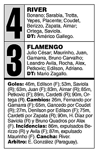 En un segundo tiempo espectacular, en el que hubo siete goles, River le ganó 4-3 al Flamengo después de ir casi siempre en desventaja, con una gran noche de Ortega, Aimar y Saviola, pese a los gruesos problemas en defensa que evidenció. Con este resultado es el único equipo argentino semifinalista de la Mercosur, y jugará con el Vasco da Gama.