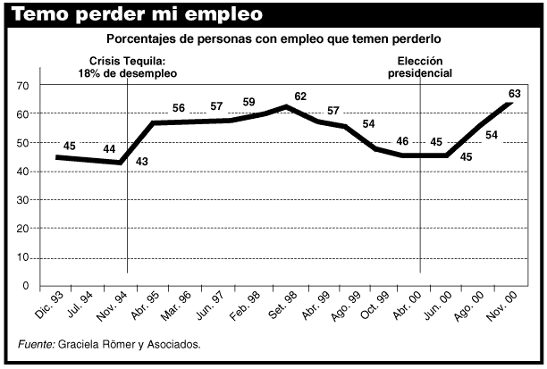 Lo notorio no es que el 63 por ciento de los consultados tenga temor a perder su empleo, sino que el índice se ha mantenido muy alto desde que se elevó -.en tiempos de Carlos Menem-. la tasa de desempleo. De todas maneras, en la actualidad se vive el pico más alto de temor, sobre todo teniendo en cuenta que subió casi 20 puntos en seis meses. |
