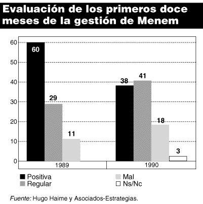El peor año Fernando de la Rúa es el presidente que hizo el peor primer año de mandato, si se lo compara con los doce meses iniciales de Carlos Menem entre 1989 y 1990 e incluso si se lo equipara con el primer año entre 1995 y 1996 del segundo mandato del riojano. El trabajo fue realizado por la consultora Hugo Haime y Asociados. En diciembre de 1999, De la Rúa superaba el 40 por ciento de imagen positiva y cayó al 8.5 por ciento. Menem inició su gestión con mayores expectativas, 60 por ciento de imagen positiva y cayó al 38. O sea que hubo una baja sensible, pero no a niveles tan pero tan bajos como los que sufre hoy De la Rúa. La comparación más cercana sería con el segundo mandato de Menem: ahí el riojano ya empezó bastante mal, con 34 por ciento de imagen positiva, y al año registraba un 16 por ciento de opiniones favorables. Al final de su mandato, igualmente Menem llegó a su peor nivel y hoy en día sigue habiendo más gente que opina mal de Menem que de De la Rúa. |
