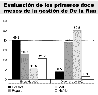 Fernando de la Rúa es el presidente que hizo el peor primer año de mandato, si se lo compara con los doce meses iniciales de Carlos Menem –entre 1989 y 1990– e incluso si se lo equipara con el primer año –entre 1995 y 1996– del segundo mandato del riojano. El trabajo fue realizado por la consultora Hugo Haime y Asociados. En diciembre de 1999, De la Rúa superaba el 40 por ciento de imagen positiva y cayó al 8.5 por ciento. Menem inició su gestión con mayores expectativas, 60 por ciento de imagen positiva y cayó al 38. O sea que hubo una baja sensible, pero no a niveles tan pero tan bajos como los que sufre hoy De la Rúa. La comparación más cercana sería con el segundo mandato de Menem: ahí el riojano ya empezó bastante mal, con 34 por ciento de imagen positiva, y al año registraba un 16 por ciento de opiniones favorables. Al final de su mandato, igualmente Menem llegó a su peor nivel y hoy en día sigue habiendo más gente que opina mal de Menem que de De la Rúa.