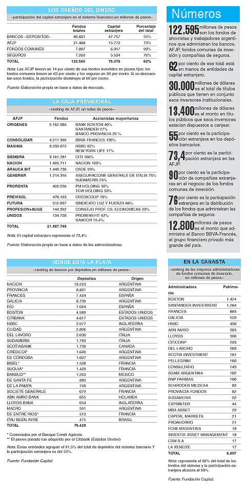Aunque la mayor parte de los títulos de deuda que canjeará el Estado se negoció con entidades financieras que operan en el mercado local, el éxito de la renegociación está atado a decisiones que se toman fuera del país. La razón es que el sistema financiero tiene un altísimo grado de extranjerizacion. Cash analizó las participaciones accionarias de bancos, AFJP, fondos comunes de inversión y compañías de seguros, concluyendo que las entidades de capital extranjero ya administran el 62 por ciento de los fondos de ahorristas y trabajadores. El mayor grupo privado es el Bilbao Vizcaya Argentaria, de capitales españoles, que con el Banco Francés, la AFJP Consolidar, su fondo de inversión y compañías de seguros administra activos por un valor de 12.800 millones de pesos. Sumado a los fondos que maneja el Santander, los grupos españoles acumulan 22.700 millones de pesos, convirtiendo a España en el país con mayor peso en el sistema financiero local.