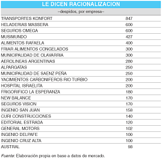 De cada tres empresas que operan en el país, una despidió personal en los últimos doce meses. Según los datos que manejan en la cartera laboral, la mayor parte de las cesantías respondió a racionalizaciones de personal con las que las empresas buscan una baja de costos por unidad de producción. En general se trata de pymes que, al contabilizar una caída en su facturación, reducen costos para equilibrar sus cuentas y no terminar en la quiebra. La segunda causa de los ceses es por cierres de empresas.