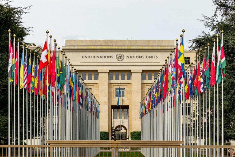 Camino de las banderas que conduce al Palacio de las Naciones Unidas, Ginebra, Suiza. (Redes Sociales)