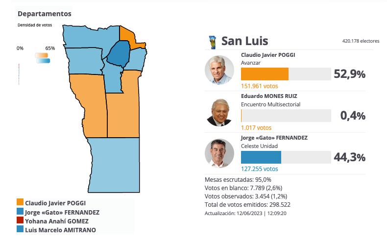 Claudio Poggi, de pasado oficialista, se impuso en la provincia con el 52,8 por ciento de los votos. En segundo lugar quedó Jorge “Gato” Fernández, impulsado por el gobernador Alberto Rodríguez Saá, con el 44,3 por ciento del electorado.