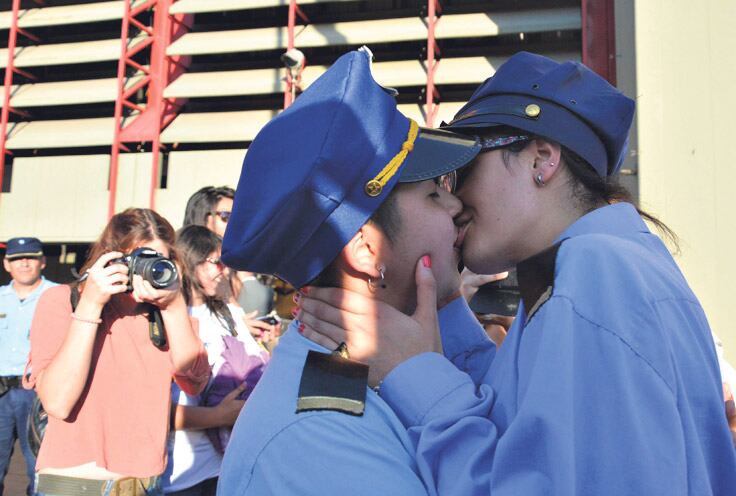 Militantes de distintas organizaciones sociales y del colectivo LGTB se besaron ayer frente al edificio de la Jefatura de la Policía de Córdoba para protestar luego que una pareja de mujeres lesbia