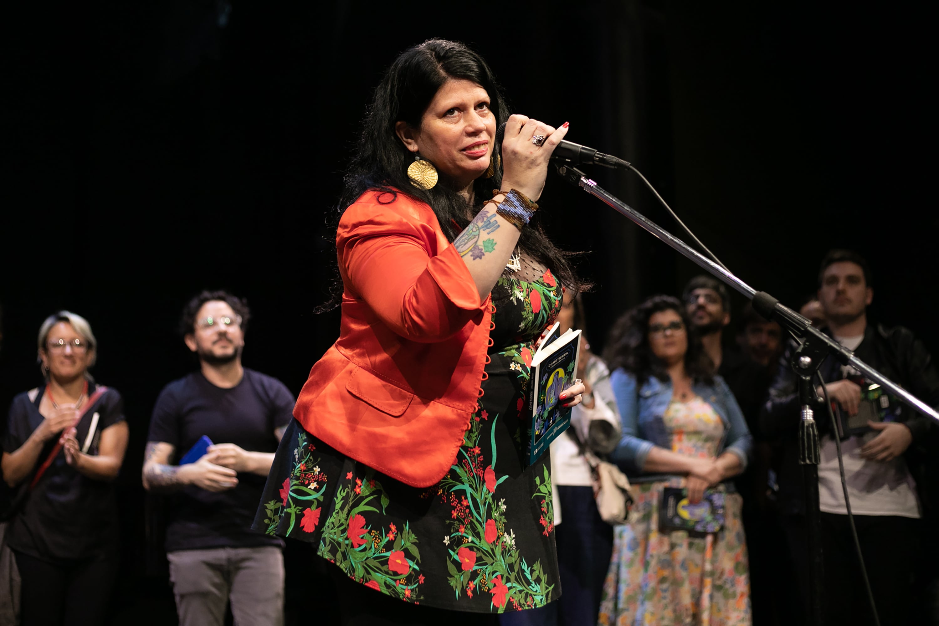 Ante una sala repleta, más de cien escritores se reunieron en el Teatro Picadero para una lectura colectiva de Cometierra (Sigilo, 2019), la novela de Dolores Reyes, a modo de