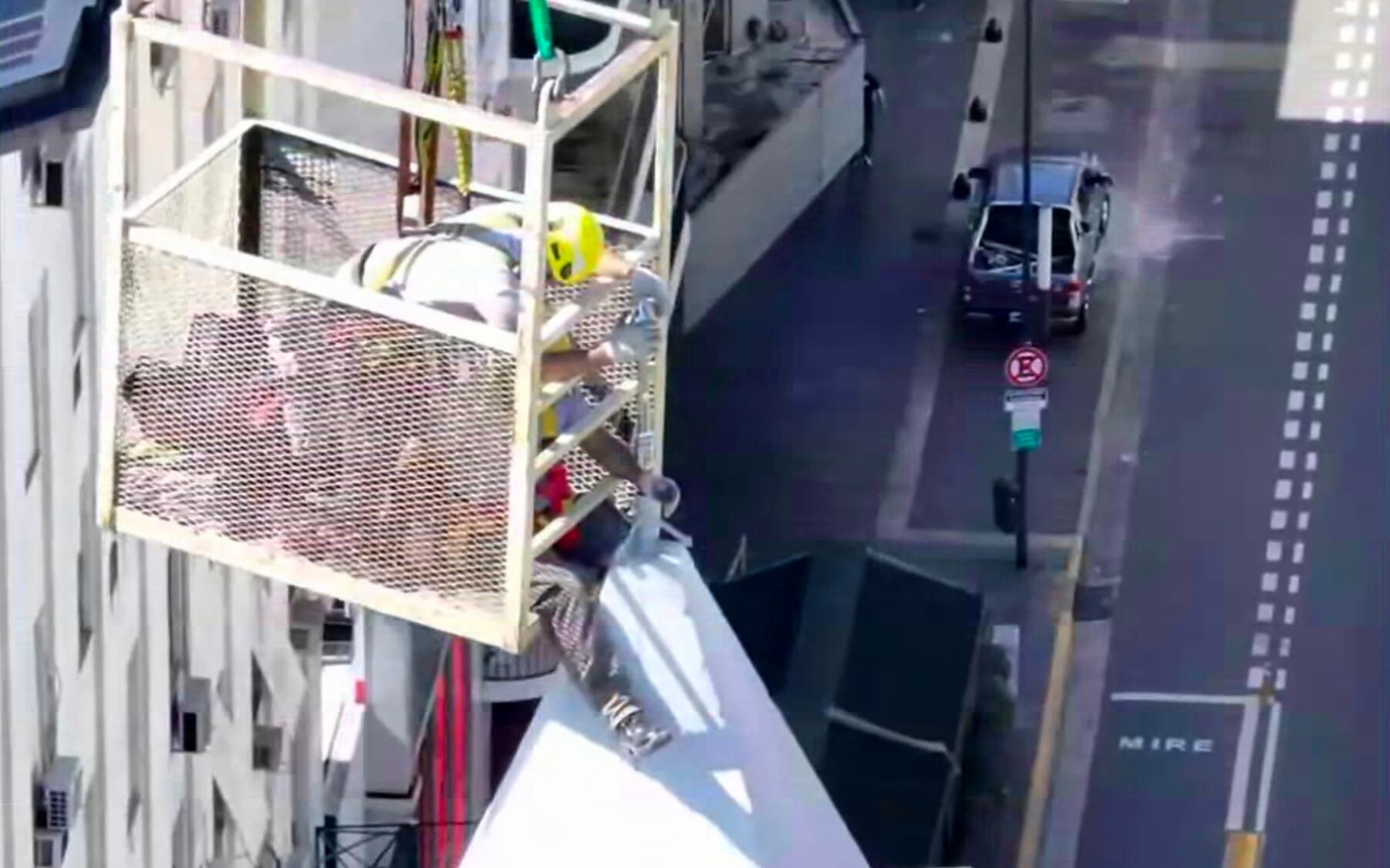 La imagen de dos hombres colgados en la punta del Obelisco, a más de 60 metros de altura, sorprendió a los transeúntes del centro porteño, durante la tarde del domingo.