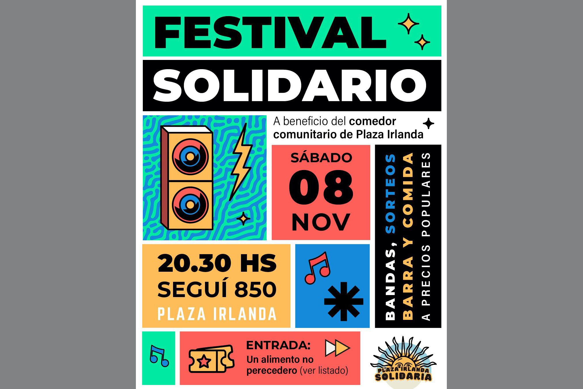 Este sábado 8 de noviembre desde las 20.30, el colectivo Plaza Irlanda Solidaria realizará un Festival Solidario en esa plaza del barrio porteño de Caballito, sobre la calle Seguí