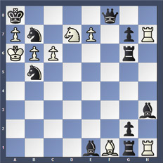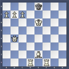 Soluciones: Los 14 mates del blanco son: 1.Ah5#, 1.Ab5#;1.Tf8#; 1.Td8#; 1.De7#; 1.Db5#; 1.Da4#; 1.Df8#; 1.a8T#; 1.a8D#; 1.b8T#; 1.b8D#; 1.c8T#; 1.c8D#.