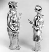 En alguna de sus aristas –en las de mayor ternura–, las piezas plateadas de Cabutti tienen como antecedente las obras plateadas de Alberto Heredia, quien trabajaba sus “roperos” de plata como condensación del relato de una vida ejemplar, en el sentido de las ejemplaridad tomada como oscilación entre lo personal y lo social.