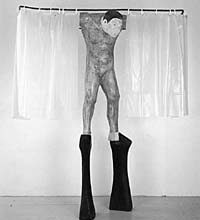 Una de las piezas centrales de la exposición es el Atlas de Leiro, que no se trata de una evocación precisa del gigante mitológico que soportaba sobre sus hombros el peso del mundo, sino de un personaje de mediana estatura, subido a unos zancos, que sostiene la cortina de la ducha. La obra, realizada en madera, hierro y plástico –de dos metros, treinta y cinco centímetros de altura; un metro setenta y dos de ancho y setenta centímetros de profundidad– sintetiza el modo en que la vida cotidiana se vuelve una rutina titánica, cuyo peso debe soportarse con cierto estoicismo.