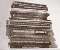 Una obra curiosa es la de los libros apilados (Bookshelf, 2004). Los diferentes (y verosímiles) lomos de cada libro (en diferentes tipografías, colores, cuerpos de letra) no informan como se espera, sobre el título, el autor y la editorial, sino que van componiendo las frases de un texto único. Aquí el artista genera un nuevo espacio de lectura, intercambiando las funciones de la cubierta del libro (incluido el lomo) con las páginas interiores. Una relación productiva entre superficie y sentido, entre promesa (expectativa) y sorpresa.