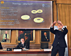 Eso estudiaron los tres científicos premiados. Thouless, de 82 años, nacido en Escocia, es profesor emérito en la Universidad de Washington en Seattle (noroeste de Estados Unidos). Obtuvo la mitad del premio, es decir 417.000 euros. La otra mitad será repartida entre Haldane, de 65, nacido en Londres, que enseña en la universidad estadounidense de Princeton (Nueva Jersey), y Kosterlitz (74), también escocés, de la Universidad Brown en Providence (Rhode Island, Estados Unidos).