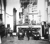 Foto tomada en el año 1900 en el Laboratorio de Física en la calle Perú 222. El negativo fue encontrado en 1971 en uno de los túneles de la Manzana de las Luces por un grupo de estudiantes de química que estaban colaborando con la mudanza al Pabellón 2 de la Ciudad Universitaria.