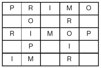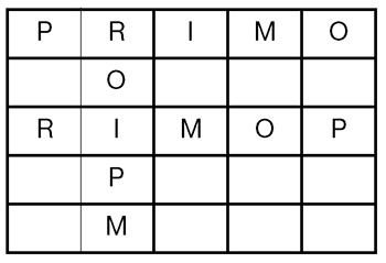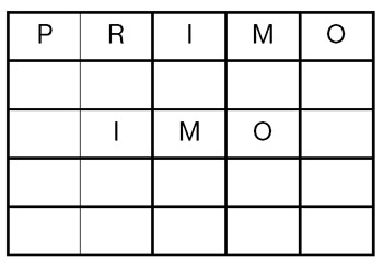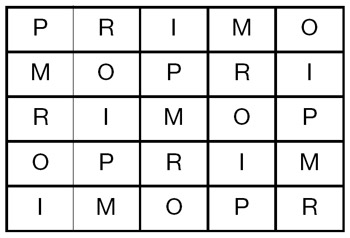 Fíjese en el siguiente cuadrado de 5 x 5. Contiene 25 casillas. La mayoría están vacías con ocho excepciones: todas las de la primera fila y tres de la tercera. Si se fija con un poco más de cuidado, en la primera fila aparecen cinco letras distintas: P, R, I, M y O. Y en la tercera, aparecen solamente tres de ellas: I, M y O.
