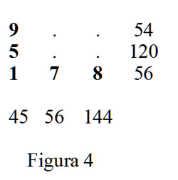Si ubicara al 9 en la tercera fila, esto significaría que el número 56 tendría que ser múltiplo de 9... ¡y no lo es! Por lo tanto, el número 9 tiene que ir en la primera fila (y eso es bueno porque el 54 sí que es múltiplo de 9) y al 1 lo ubico en la tercera fila. En consecuencia, tenemos ubicados ya los números en la primera columna, tal como aparecen en la Figura 3.
