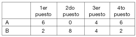 Para verificar que se entiende “la tabla” que figura acá, el colegio A obtuvo seis primeros puestos, ningún segundo puesto, cuatro terceras posiciones y sus estudiantes terminaron cuartos en seis oportunidades. De la misma forma hay que interpretar lo que sucedió con el colegio B.