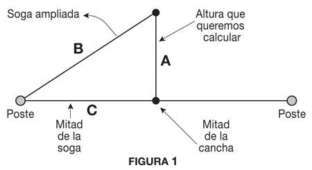 Ahora, vayamos hasta la mitad de la cancha y comencemos a levantarla. ¿Se podrá levantar mucho? Fíjese en el dibujo que aparece en la Figura 1. Como se ve, hice un esquema que sirve para graficar la situación. En principio, dibujé un triángulo de manera tal que cada lado represente una parte del problema.