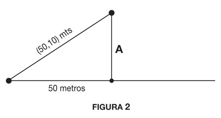 Ahora, mire la Figura 2 en donde aparece otra vez el triángulo. El lado horizontal C mide 50 metros y el lado B (que lleva el nombre de “hipotenusa”) mide la “soga ampliada” (50,10) metros. Esto quiere decir que B = 50,10 metros y C = 50 metros. Reemplacemos la igualdad (*) con los números que correspondientes y le recuerdo que el número que no sabemos es el que llamé A (que corresponde a la altura). Se tiene entonces: