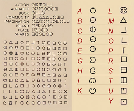 Como usted ve, al lado de cada palabra que aparece en la Figura 1, hay un grupo de símbolos. Como el número de símbolos se corresponde con la cantidad de letras de cada palabra que está a la izquierda, uno puede conjeturar que cada símbolo representa una letra. Para corroborarlo, basta ver que cada vez que aparece una letra “A” (como se ve por ejemplo en ACTION o IMAGINATION), el símbolo que está sobre la derecha, se corresponde no solo con la letra sino también con la ubicación, y lo mismo con todas las demás. Eso permite hacer una asociación entre letras y símbolos.