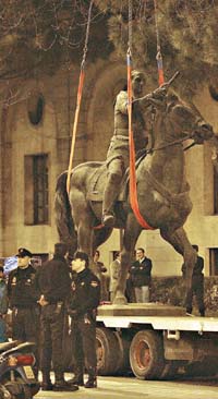 Lo que nos lleva al episodio acontecido en Madrid hace unas noches cuando –de golpe y sin aviso– se retiró la última estatua de Franco que quedaba en la ciudad. A Miguel Angel le llevó tres días transportar desde su estudio y plantar su David en una plaza de Florencia. Franco, en cambio, fue removido en un ratito. Una estatua grande y alta que desde 1956 y por 49 años tiranizaba el perímetro de la Plaza de San Juan de la Cruz, en el barrio de Nuevos Ministerios. Y, claro, algunos revolearon bufandas eufóricas y otros se rasgaron las vestiduras. Y lo cierto es que en noviembre del 2002 el Congreso había aprobado por unanimidad una declaración –promovida por el PSOE pero asumida también por el PP– donde se condenaba la represión de la dictadura. Pero una cosa son las palabras y –ojo, que todavía quedan Francos en Santander, Melilla y Guadalajara cuyas desapariciones ya han sido anunciadas– otra muy diferente son las estatuas. Así, al día siguiente el opositor a todo y portavoz del PP Eduardo Zaplana criticaba al “gobierno más radical de la historia democrática” por sus “lecturas parciales de nuestra historia”. Mariano Rajoy –líder y, por lo tanto, más sutil– condenaba a Zapatero por “resucitar el pasado” con “un acto de cara a la galería”. El PSOE e Izquierda Unida se felicitaron mutuamente por acabar con un símbolo “de división” –la orden de obras solicitada el pasado 24 de febrero especificaba una “revisión” (con retirada, si procede)–, cuyo lugar será ocupado por un monumento “que celebre la concordancia entre los españoles”. Lo que es relativo, claro; porque al correrse la voz fueron varios los que se acercaron al lugar –mientras un camión se llevaba a Franco y a su caballo cubiertos por un pesado manto– para dejar flores, cantar Cara al sol bajo la luna con el brazo en alto, aullar cosas como “¡Con nocturnidad y alevosía!” y “¡Democracia mierda y Constitución mierda!” o agarrarse a patadas con el que saltaba de felicidad haciendo flamear una bandera de la Unión Europea. Una señora muy elegante se lamentaba con “me lo hubieran dado a mí, que tengo un jardín precioso en mi finca de Valladolid”, un adolescente se preguntaba cómo indicarle a un levante de horas atrás que “ya no podrían quedar junto a la estatua del Franco”, y Joaquín Sabina –que venía del 99 cumpleaños del escritor Francisco Ayala y, al enterarse, decidió darse una vueltita– se acercó a las cámaras para, aforístico, soltar un “Está bien que no esté”.