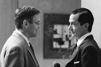 Buenas noches, y buena suerte es el segundo largometraje de George Clooney. Clooney, se sabe, es el mejor y más simpático y más querible galán cinematográfico desde Cary Grant. Alguien que desconfía del matrimonio como institución, que adora a su cerdo mascota, que es un bromista de cuidado durante los rodajes, que tuvo éxito tarde y que no le importa que así haya sido, y que –todo parece indicarlo– es alguien muy inteligente. Se sabe también que Clooney es un hijo de la televisión: su padre empezó como periodista de noticiero, el pequeño Clooney debutó en la tele a los cinco años en The Nick Clooney Show, con el tiempo participó en varias series clase B y grabó varios pilotos que se estrellaron, hasta que le llegó su hora con E.R. No es casual entonces que la primera película de Clooney fuera, en el 2002, Confesiones de una mente peligrosa, un casi lisérgico trip por el mondo trash de los concursos de los ‘70 (y, de paso, por las supuestas y delirantes conexiones de un productor de éxito que en sus ratos libres trabajaba como asesino a sueldo de la CIA). No es casual tampoco que, una vez ventilada la basura, Clooney haya optado para su segundo proyecto por otra historia verdadera que, esta vez, se ocupa de un puñado de hombres valientes dispuestos a utilizar la televisión como señal de alarma que despierta en lugar de ojo catódico que hipnotiza y duerme.