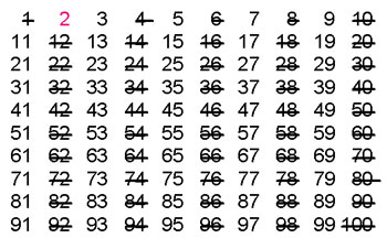 Es decir, si paráramos acá, habríamos descubierto (con el método de Eratóstenes) que todos los números primos que hay entre los primeros cien números, son: 2, 3, 5, 7, 11, 13, 17, 19, 23, 29, 31, 37, 41, 43, 47, 59, 61, 67, 71, 73, 79, 83, 89, 91 y 97.