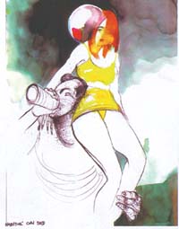 Lucano trabajó como diseñador e ilustrador en La Maga, La García y ahora codirige el semanario Barcelona. En la inauguración, gente del periodismo gráfico se cruzaba con dibujantes, ejecutivos, promotoras que repartían cajas de forros y mozos que servían bebida y canapés. Un saxofonista apostado contra una columna del garaje soplaba acordes melosos. Al fondo, en una suntuosa habitación de dos pisos cuyo turno se paga 300 pesos, Lucano brindaba con los ejecutivos del látex. Hechos en tinta, los dibujos de Chilaut plantean situaciones de trasfondo de discoteca, de baño público y de pasarela, pero operan más en el plano de la sensualidad que de la pornografía. “Hay mucha imaginería de boliche”, dice el autor. “Me gusta mirar. ¿A quién no? Si me digo dibujante, mirar es mi profesión.”
