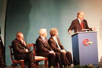 “Por el lenguaje se define mi presencia en el mundo”, confesó el nonagenario narrador español Francisco Ayala, encargado de inaugurar los discursos, en un mensaje grabado que fue proyectado en las cuatro pantallas gigantes del teatro. Ayala situó a la lengua en un estatuto comunitario para todos los seres humanos: “No hace falta ser poeta, dramático o filólogo para que la lengua resulte algo propio a nuestra especie, algo inherente a la humana condición”, señaló. “Mi larga vida está embarrada por el uso del idioma, de este idioma español que he tenido la suerte de practicar en mi tierra europea como en la generosa extensión del territorio americano.” El mexicano Carlos Fuentes, quien habló en representación de América latina, parecía un actor de cine recitando versos y encandilando con su oratoria a la platea: gallardo, elegante, locuaz, su intervención fue aplaudida largamente de pie.