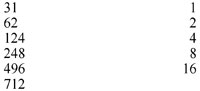 La primera columna se obtiene así. Empiezo con el número por el cual queremos dividir. En este caso, el 31. A partir de él, yendo hacia abajo, voy multiplicando por dos en cada paso. ¿Por qué paré en el 496? Porque si multiplico por dos el 496, obtendría un número (992) que es más grande que el 712 (el número que quería dividir originalmente). Justamente, en lugar de poner el 992, pongo el 712.
