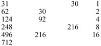 Este número es el que estábamos buscando. El resultado al dividir 712 por 31, es 22 y sobra el número 30, que es el que figura en la columna 3 y con el que paré el proceso.