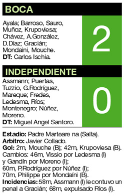 Pero el conjunto rojo no reaccionó, Boca siguió siendo más, mucho más y no extrañó que antes del entretiempo llegara el segundo tanto. El tucumano Krupoviesa avanzó por su lateral, recibió la habilitación de Gracián, encaró por su sector, dejó en el camino a Tuzzio (de mala actuación en general) y al pisar el área sacó un zurdazo cruzado que superó la estirada de Assmann.