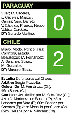 Chile dio un paso vital en la búsqueda de la clasificación para el Mundial. Con una excelente actuación colectiva, con la figura de Matías Fernández, con fortaleza para plantarse en una situación adversa y con algo de fortuna para superar algunos momentos críticos en el partido, el conjunto de Marcelo Bielsa venció 2-0 a Paraguay, que sumó un punto de los últimos nueve y perdió el liderazgo por diferencia de goles a manos de Brasil, casualmente a quien visitará el miércoles.