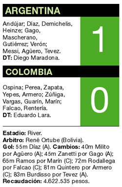 Más allá de la victoria y de la tenue mejoría en el complementario, el equipo de Diego Maradona volvió a dejar una floja imagen. El único gol del partido lo anotó el Cata Díaz en una jugada de corner. Fue bueno el debut de Andújar en el arco.
