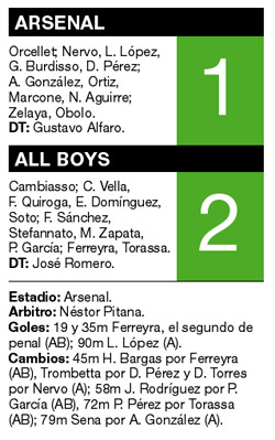 All Boys venció ayer 2-1 a Arsenal, en el comienzo de la octava fecha del torneo Apertura, y salió de la zona de Promoción, en la que volvió a dejar a San Lorenzo. Los goles del ganador fueron anotados por el delantero Juan Carlos Ferreyra, en la primera etapa, el segundo de tiro penal, mientras que Lisandro López descontó para el local en tiempo de descuento. Con este resultado, All Boys suma nueve puntos y pudo volver a salir de la zona de riesgo, mientras que Arsenal quedó con ocho y perdió ayer su cuarto partido como local en el torneo: los otros fueron ante Colón, Vélez y Godoy Cruz. Además, el conjunto de Floresta dejó atrás una racha negativa de dos derrotas consecutivas (Godoy Cruz y Banfield).
